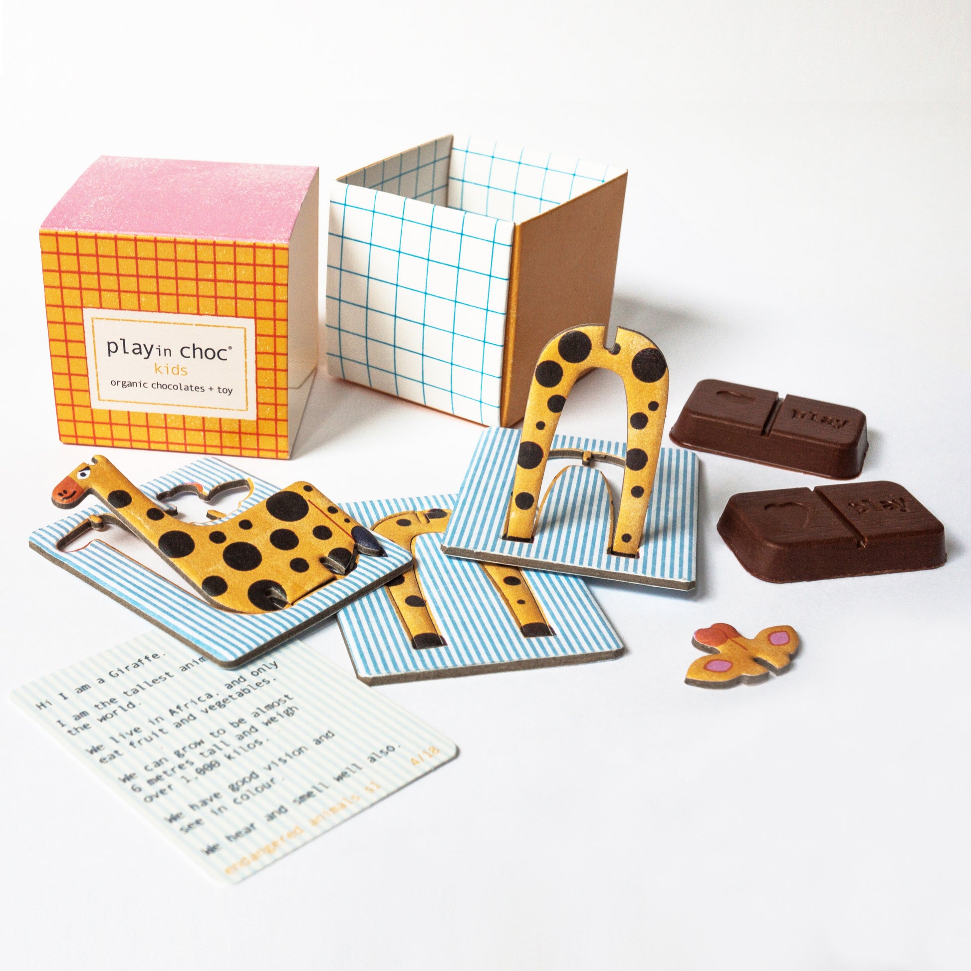 PLAYin CHOC Endangered Animals Edition Toy Choc Box contains 2 x 10g individually wrapped, deliciously creamy, organic dairy free chocolates and a delightful card toy to assemble.