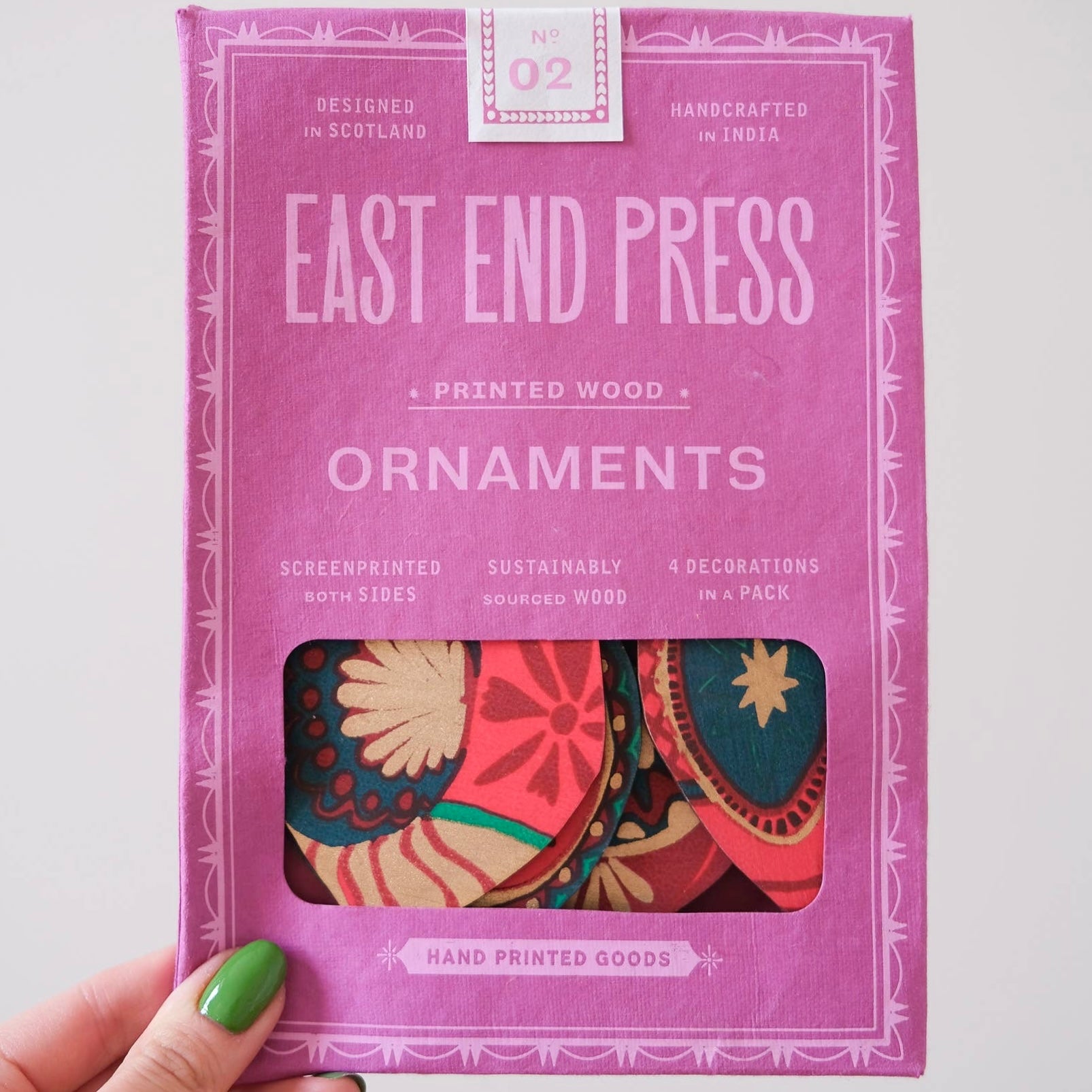 Four traditional Christmas ornaments make up this set of wooden decorations, inspired by vintage glass baubles.