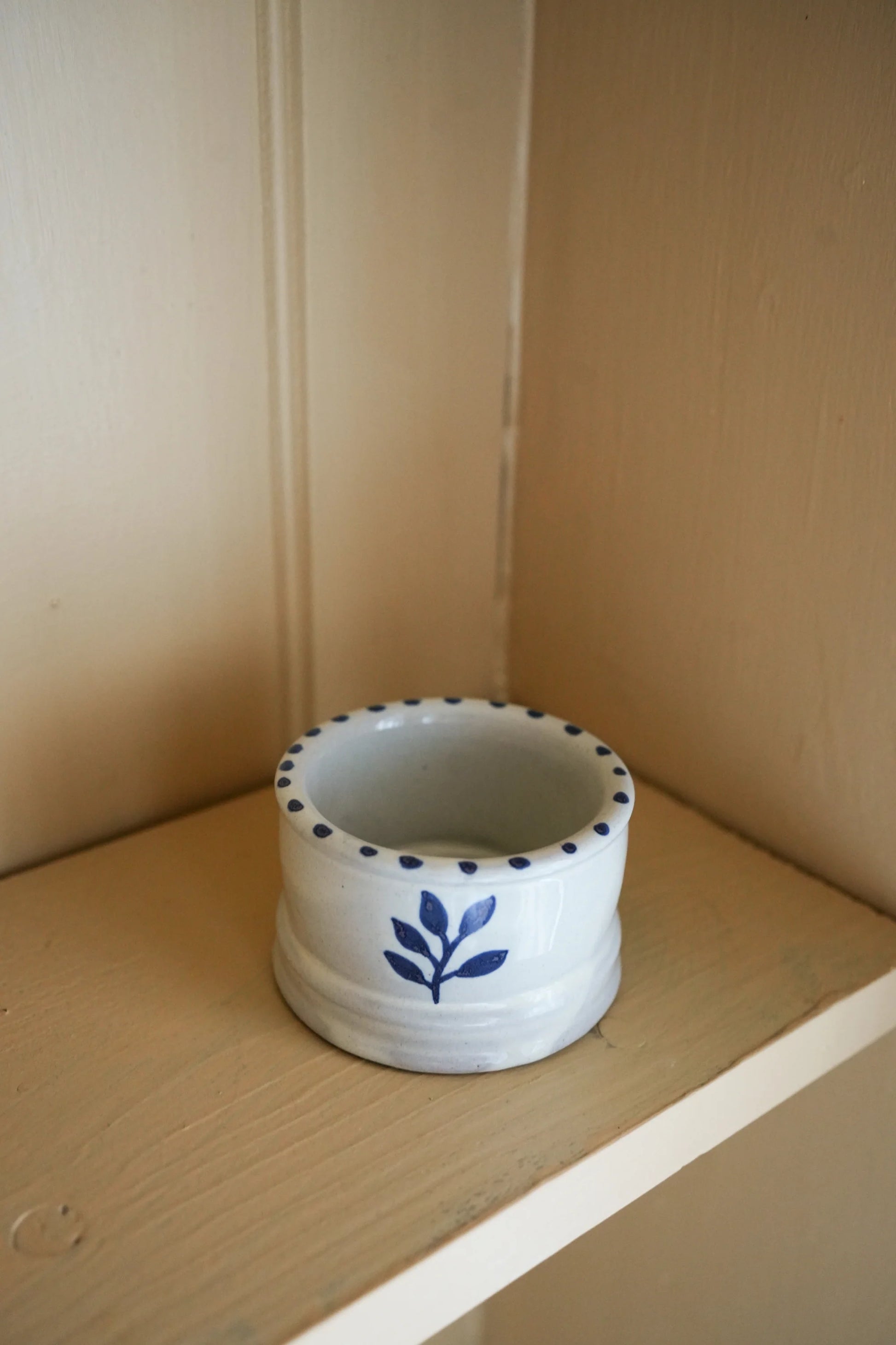 A small pot with hand painted with a sweet little sprig hand painted on the side and spot details around the rim.