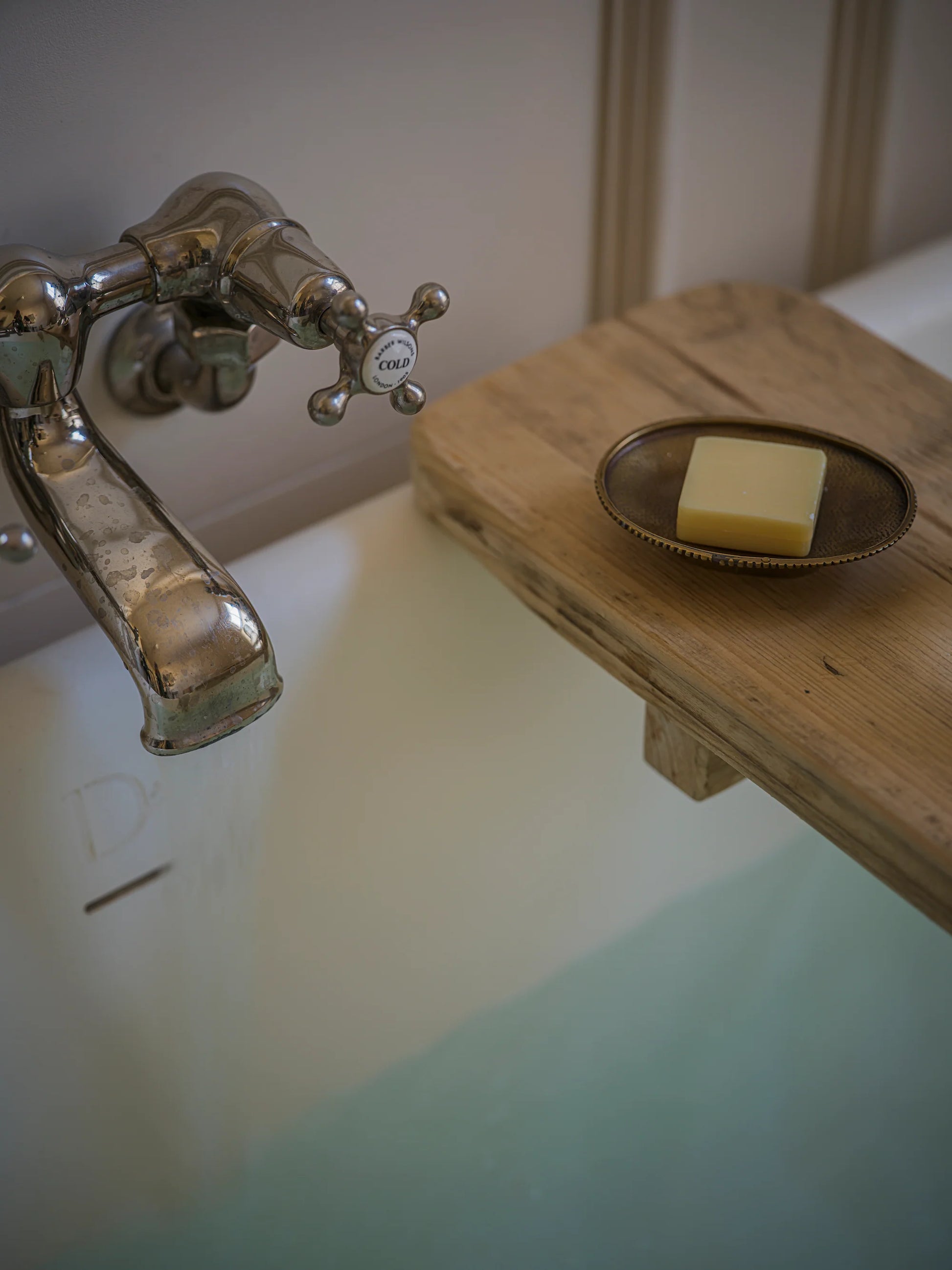 Its aged brass tone complements natural materials beautifully – from timber shelves to stone basins – and it pairs especially well with bath boards or wooden accessories in curated retail displays.