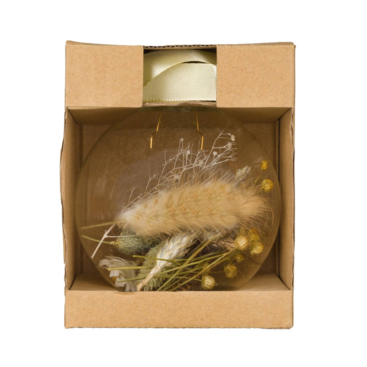 Exquisite White and Gold Christmas Bauble with dried flower arrangement.