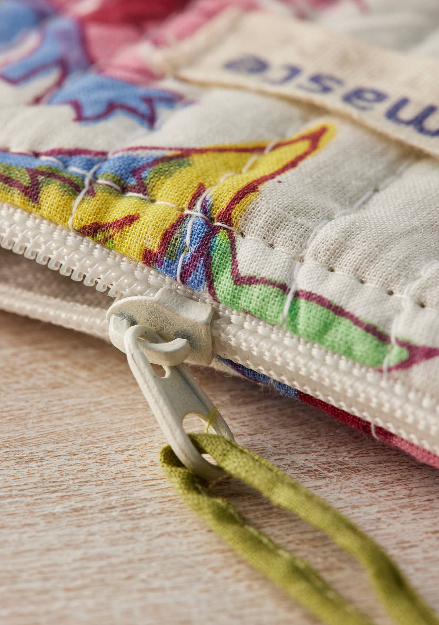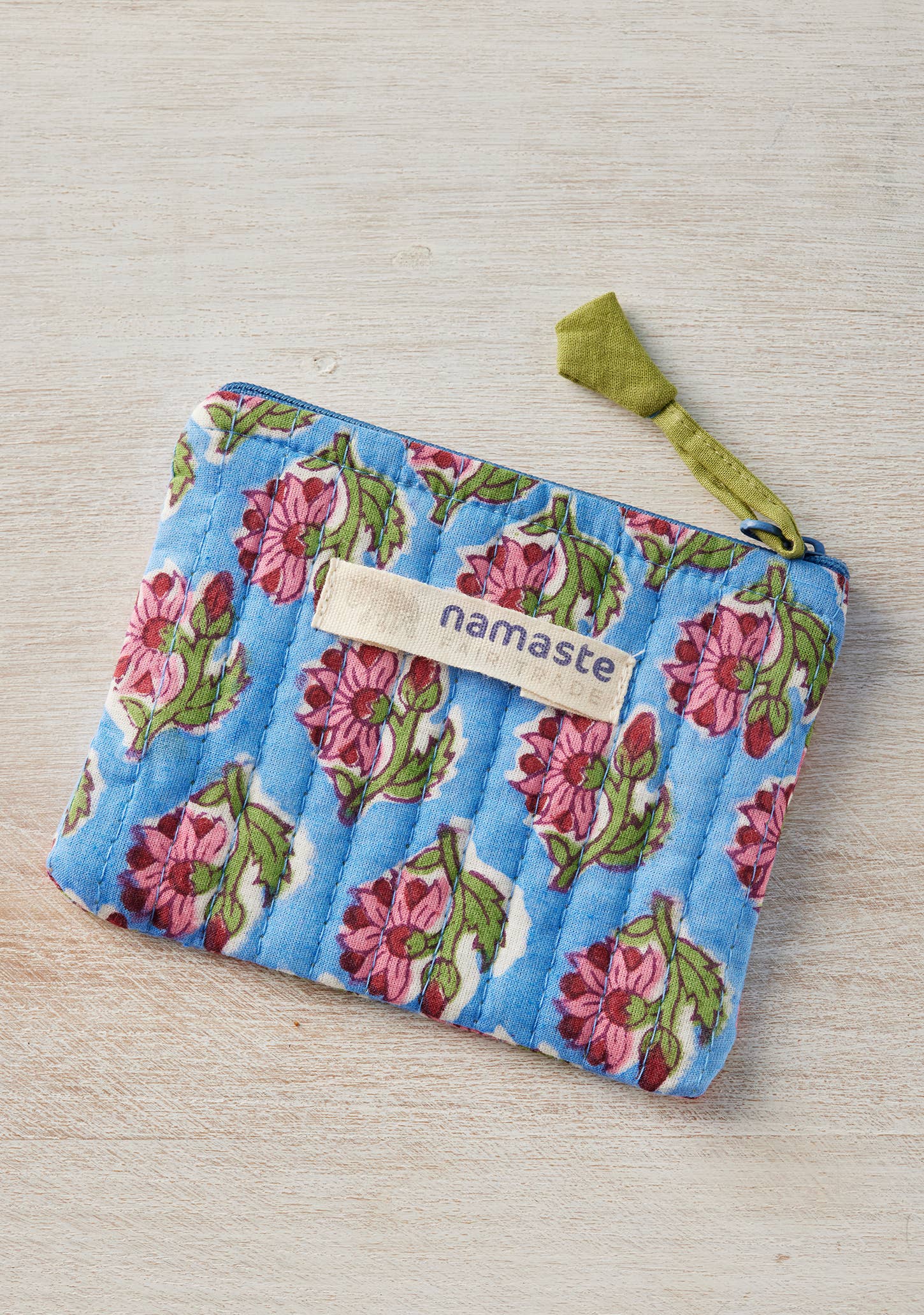 Elegant Indian block print pouch purse featuring stylish and colourful decorative Kantha stitching finished with a complementary fabric zip tie. Perfect size for dropping into a pocket, beach bag or tote.