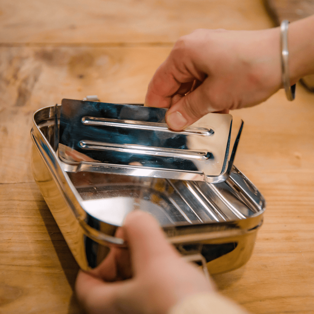 Each box is highly durable and made from 100% food-grade stainless steel which won't stain or carry odours from your last lunch and is rust resistant. The larger box lid is secured with a roller clamp on either side which gives a firm close and is super easy to open.