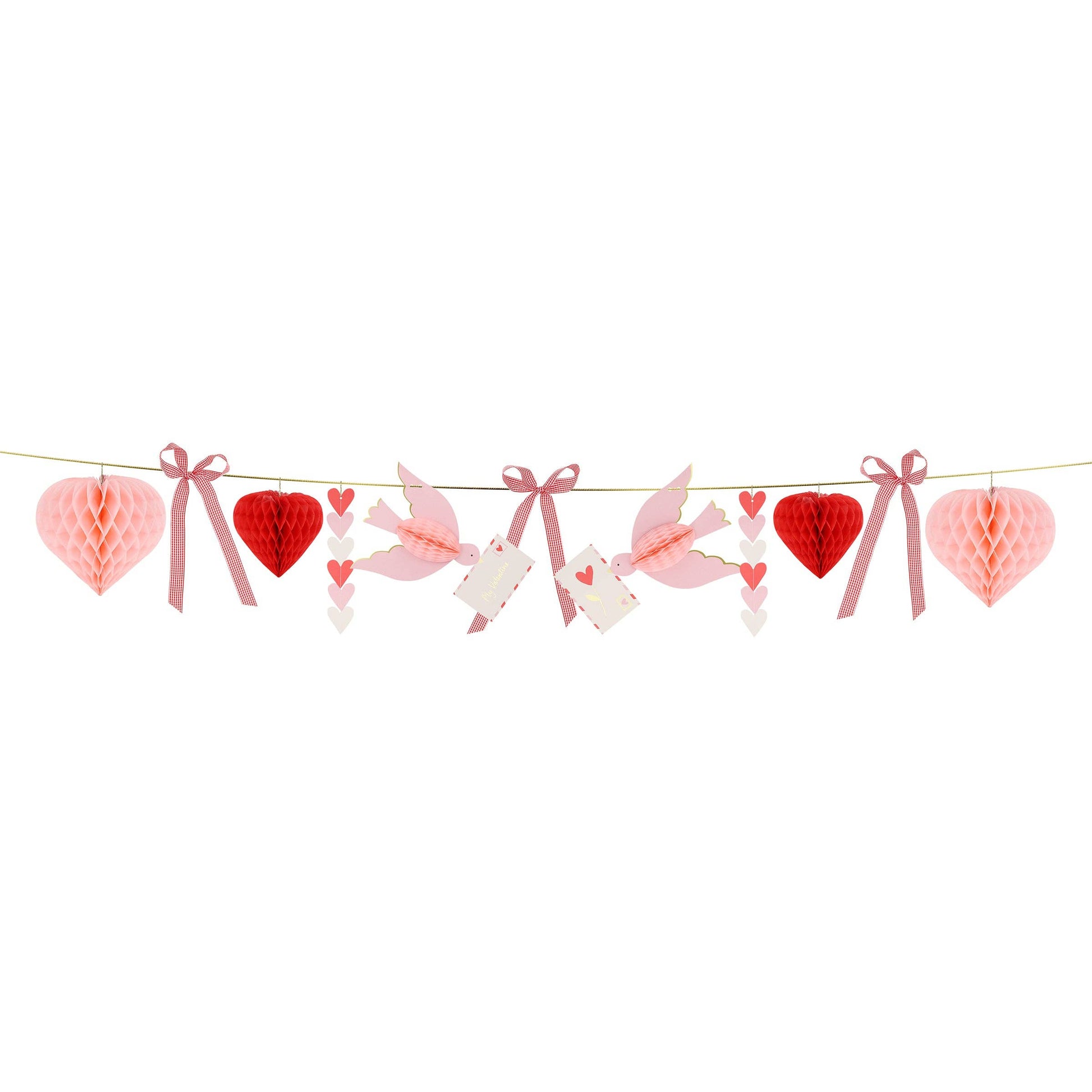 A single pink themed valentines garland with a gold cord (and extra cord for hanging) Garland composes of 2 Dusky pink paper love bird pennants with 3D honeycomb on one side, 3 Red and white gingham ribbon bows, 2 Red / pink and white paper heart chains, all stitched with cream thread. These are dotted between 2 Large dusky pink honeycomb hearts and 2 small red honeycomb hearts.