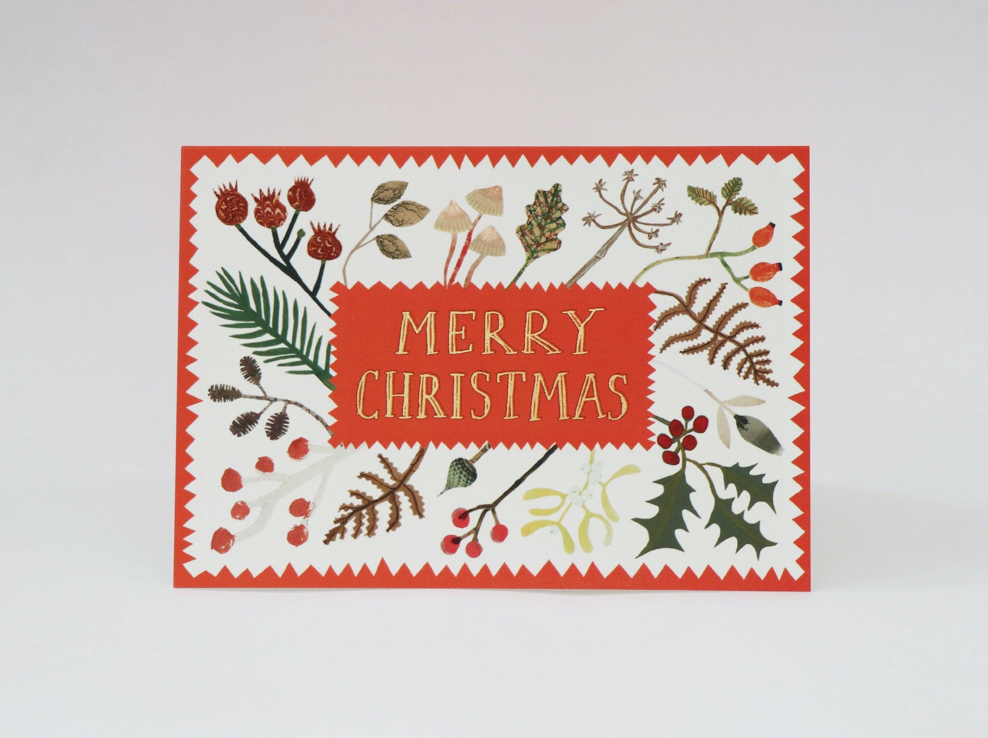 Featuring an array of winter leaves and plants, carefully collaged from colourful textured antique papers, scripted Merry Christmas lettering and finished off with a lovely red festive border.