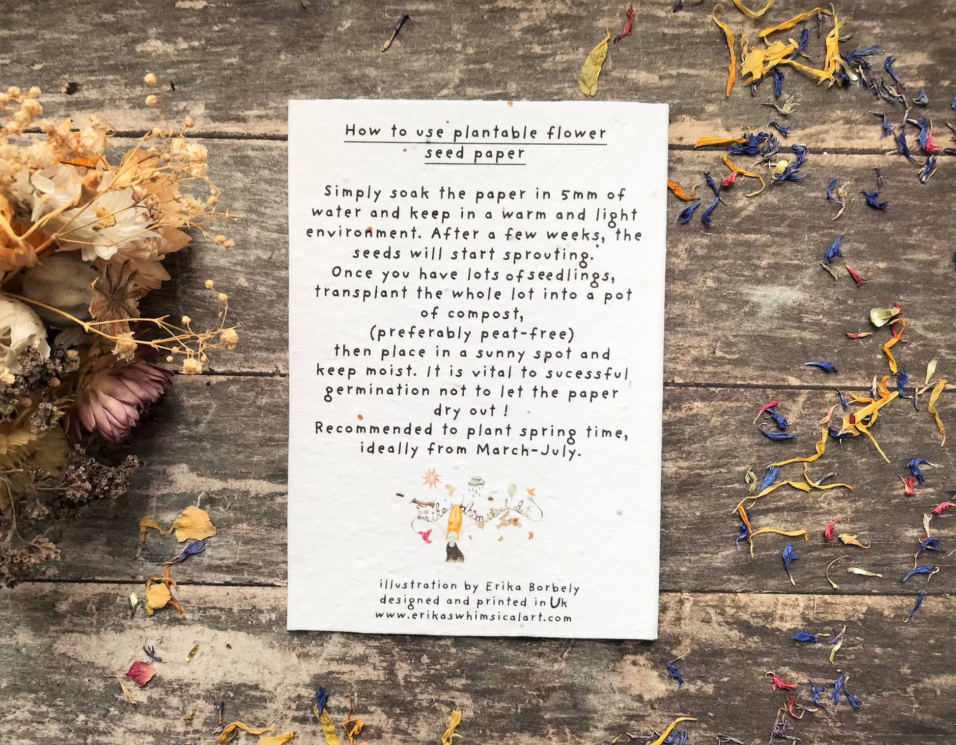 Plantable Seed Paper Greeting Card, Blank Inside, Flower & hare Illustration. The greeting card that keeps on giving. These blooming marvellous Eco-friendly cards are plantable and transform into beautiful flowers. Our seed paper is tree-free! Made of 100% Pre-Consumer Recycled Cotton that degrades naturally in the soil. Simple planting instructions are printed on the back of the card. Details: * It is a thick recycled paper (about 150 gsm) embedded with various flower seeds. Seeds include Sweet Alyssum, Poppy, Baby’s Breath & Rudbeckia. These are non-invasive species that are commonly found in garden shops and can be grown in pots and left outside for bees and other pollinators. * Printed using an Inkjet Printer * Comes with an A6 size 100% recycled envelope in natural colour.