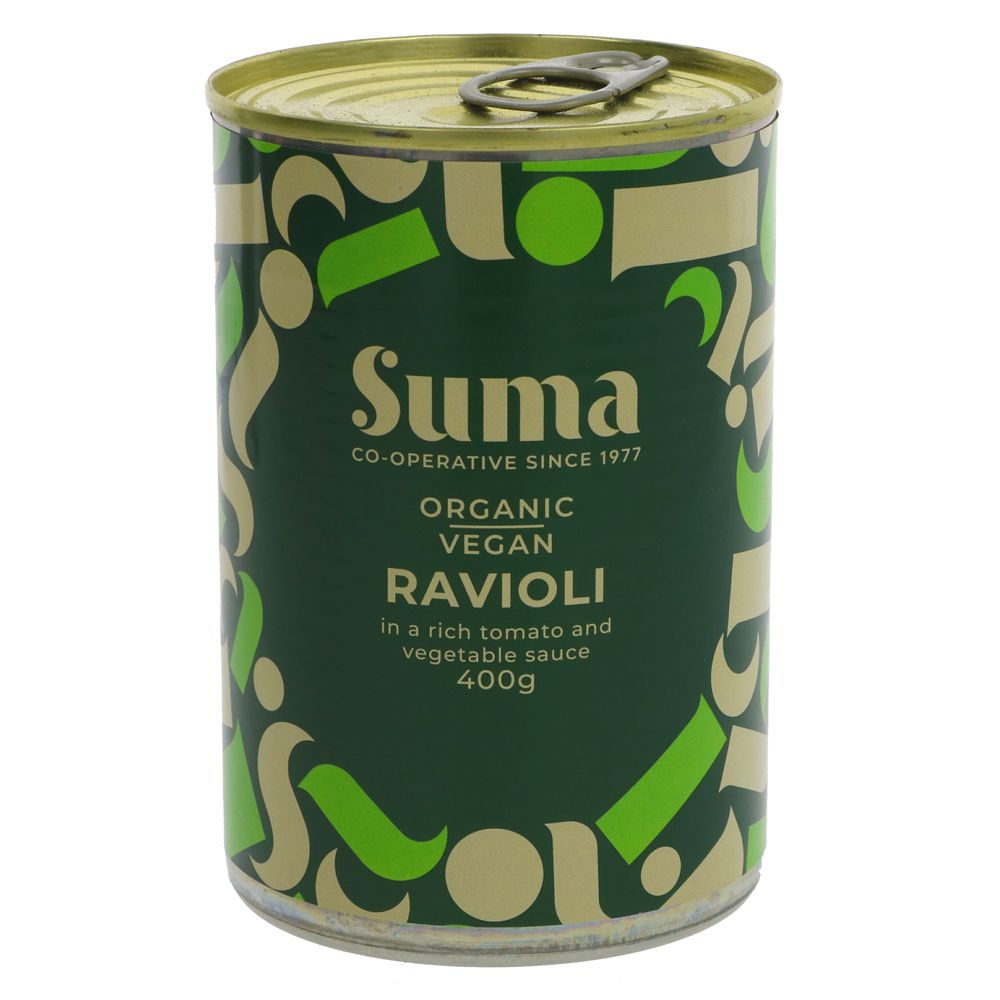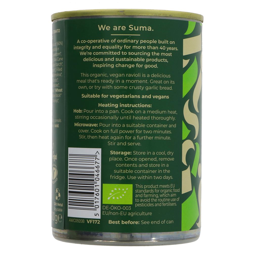 Tomato and vegetable sauce* (60%) [water, tomato puree* (31%), vegetables in varying proportions* (17%)(carrots* , sweetcorn*, peas*, green pepper*), tomatoes* (11%), raw cane sugar*, sea salt, celeriac* (celery*), maize starch*, spices*, basil*, lemon juice concentrate*], filled ravioli* (40%) [pasta* (durum wheat semolina*, turmeric*), filling* (vegetables* (carrots*, parsnips*, onions*, bell pepper*, tomatoes*, spinach*), potato flakes*, breadcrumbs* (wheatflour*, yeast*), sunflower oil*, vegetable stock* (sea salt, onions*, carrots*, leek*, parsnip*, herbs*, spices*), pepper*.] *from organic farming