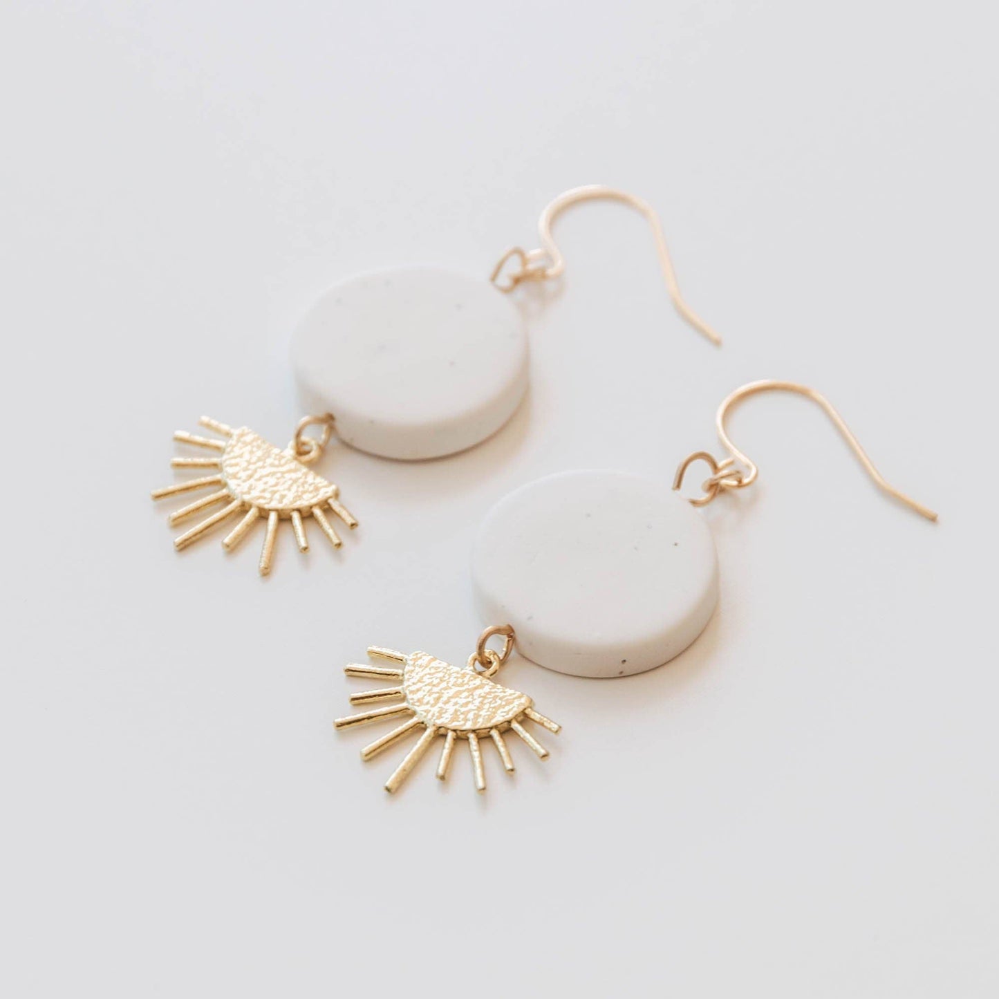 Our Oat Speckle Sunset Drop Earrings are handcrafted in by Pepper You in her Brighton studio using polymer clay and sustainable brass. These lightweight earrings are custom pigmented, hand-cut, baked, drilled, sanded, finished, and assembled with so much love.