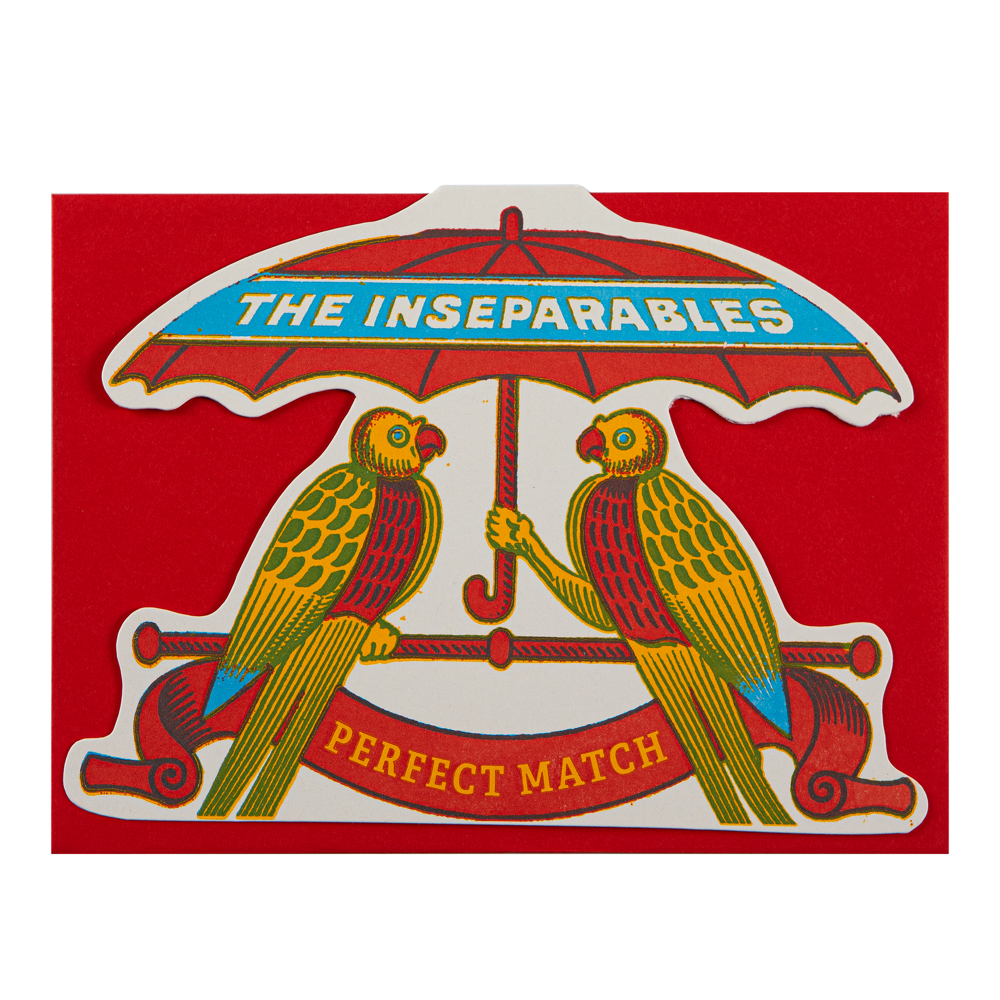 Our letterpress cut-out card featuring two birds sitting under an umbrella together with the words 'The Inseparables, Perfect Match.'